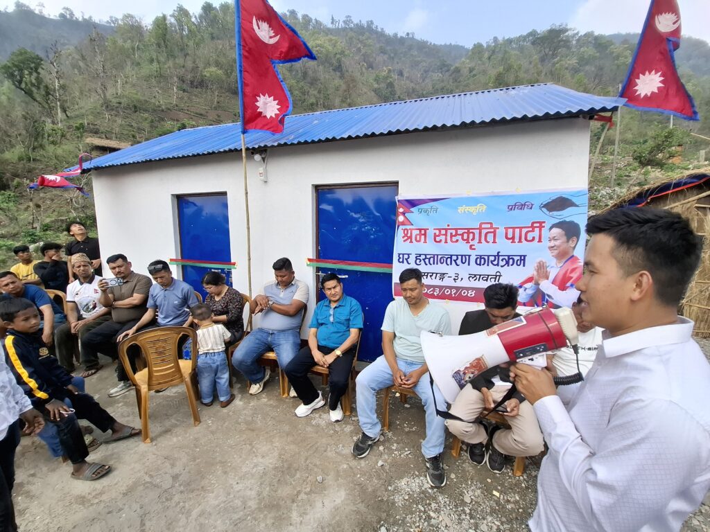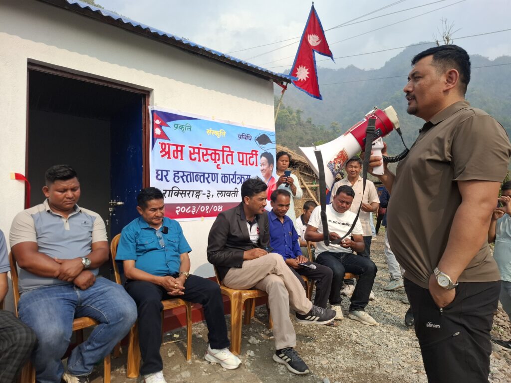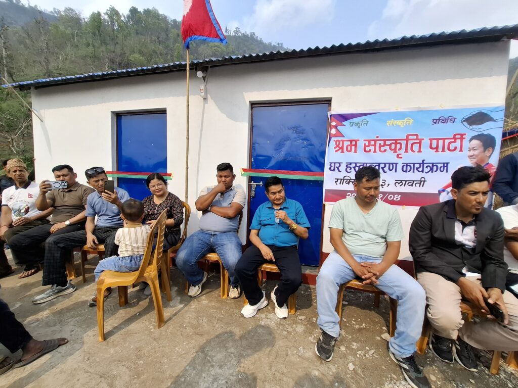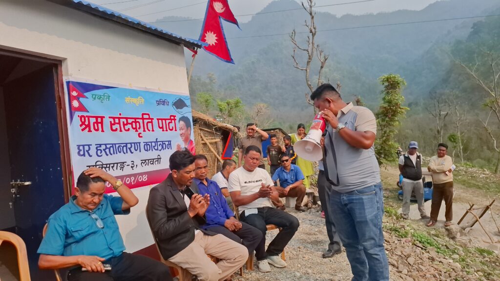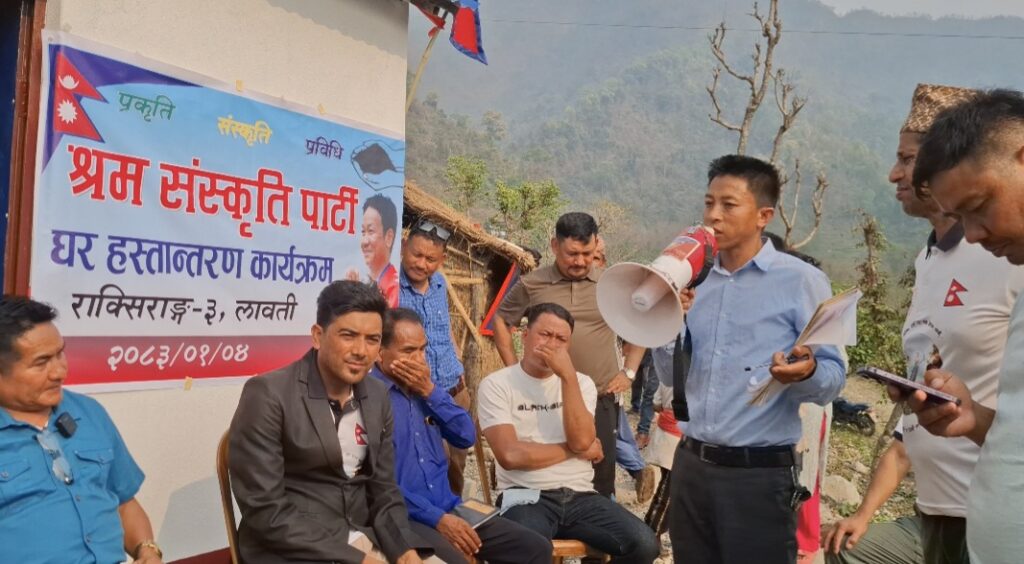 श्रम संस्कृति पार्टी, राक्सिराङ गाउँ कमिटीको आयोजनामा आगलागीबाट घर बिहिन भएकी राक्सिराङ्ग गाउँपालिका–३, लावतीकी निशा माया चेपाङको परिवारलाई नयाँ घर निर्माण गरी हस्तान्तरण गरेको छ ।