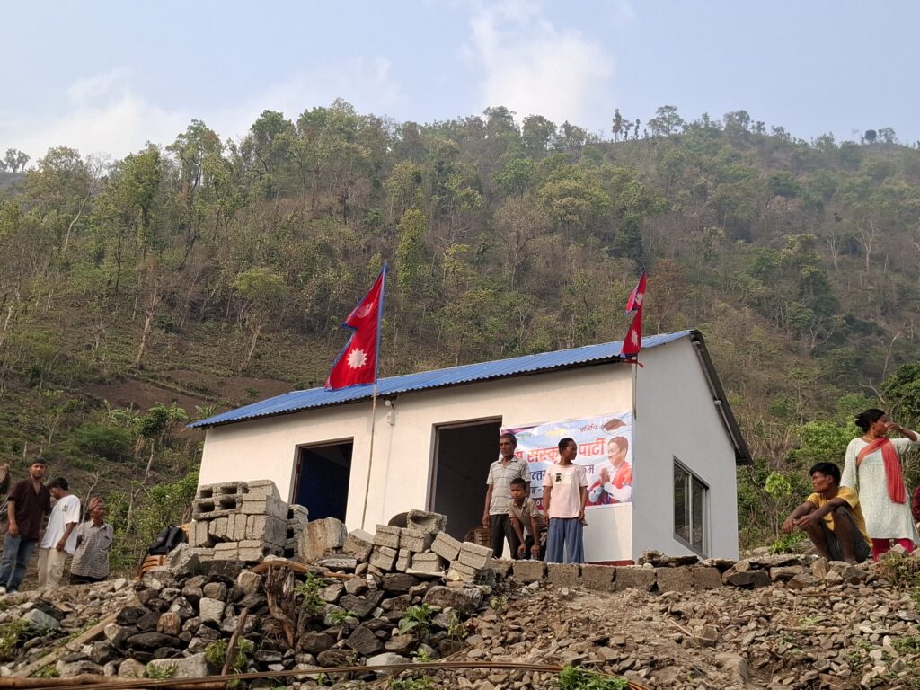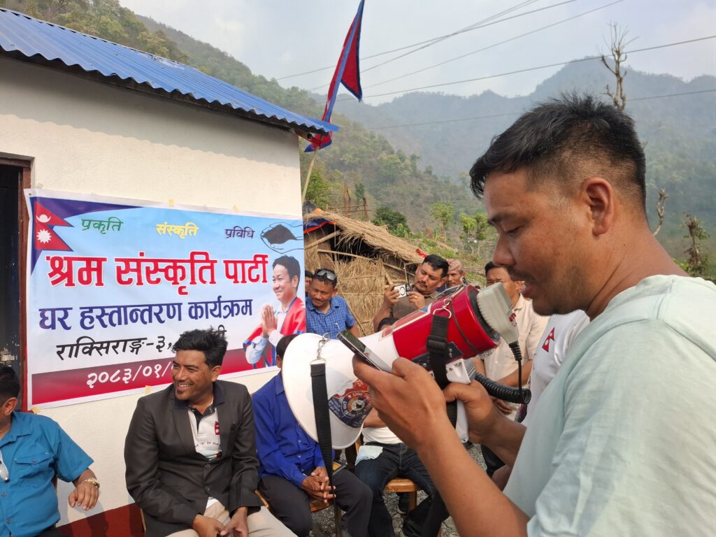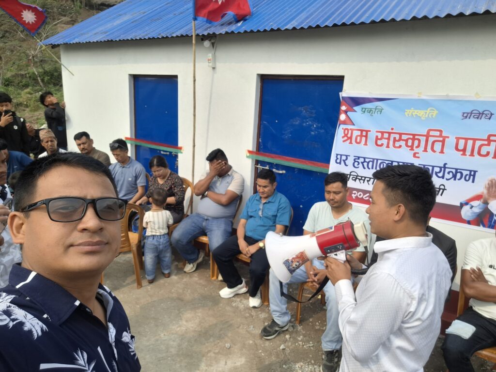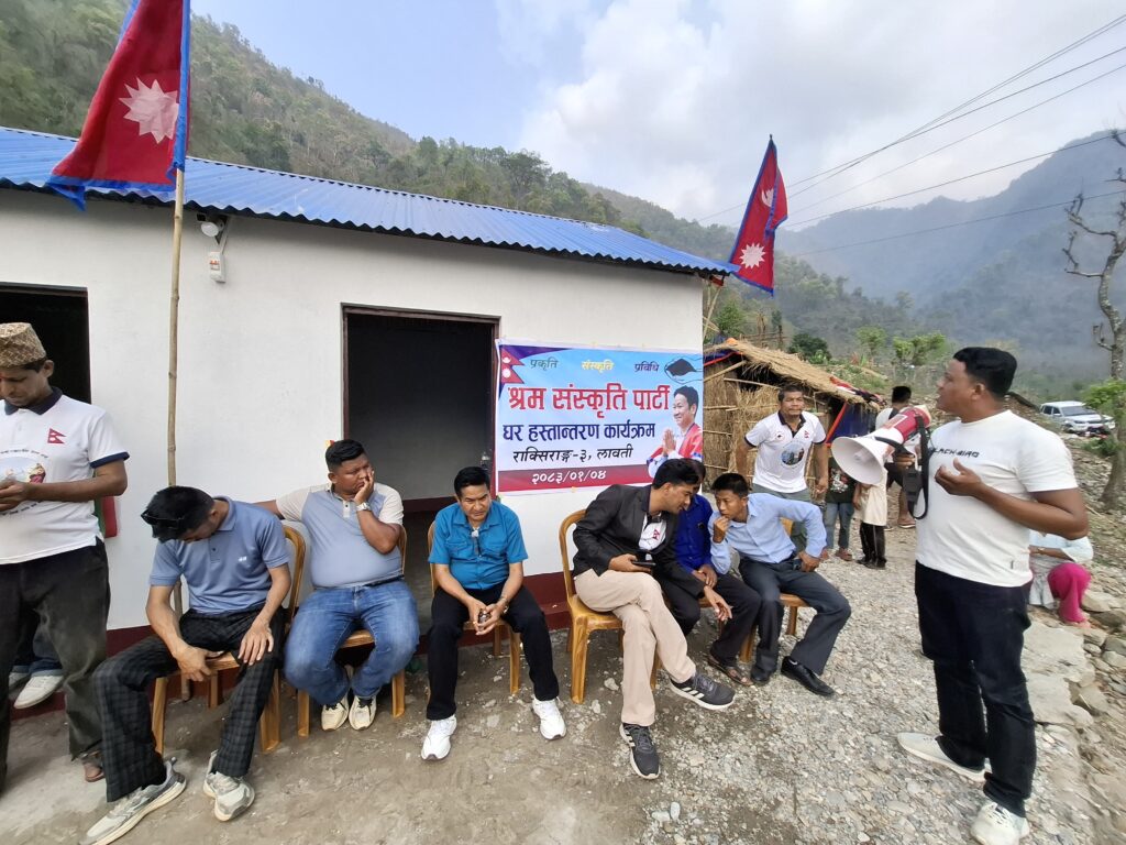 श्रम संस्कृति पार्टी, राक्सिराङ गाउँ कमिटीको आयोजनामा आगलागीबाट घर बिहिन भएकी राक्सिराङ्ग गाउँपालिका–३, लावतीकी निशा माया चेपाङको परिवारलाई नयाँ घर निर्माण गरी हस्तान्तरण गरेको छ ।